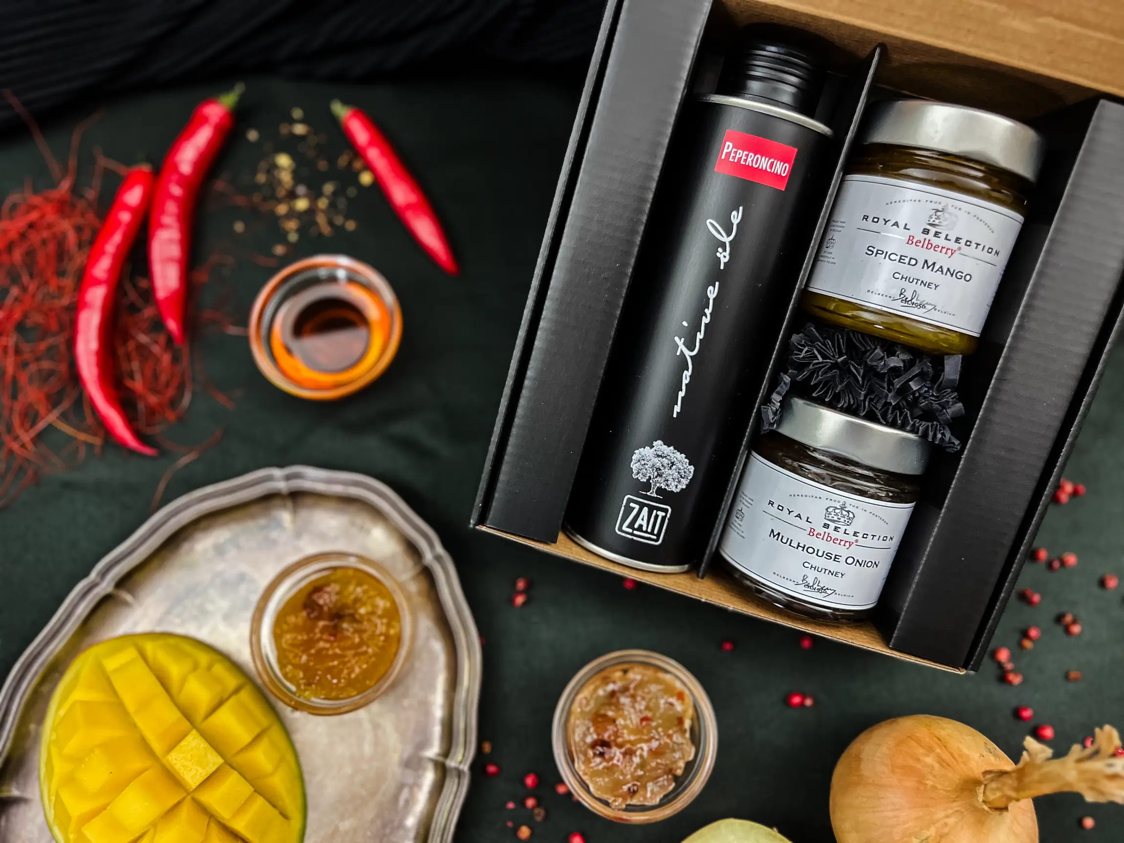Ein Geschenkset für Liebhaber der würzigen Küche: Unser Olivenöl mit Peperoni verleiht Gerichten eine pikante Schärfe und intensive Aromen. Dazu das fruchtige Mango Chutney, das mit seiner süß-pikanten Note gut zu Käse, Fisch, Fleisch und Gemüsegerichten passt. Ebenso wie das aromatische Zwiebel-Chutney, ein Alleskönner ob zu Burgern, Gegrilltem, Ente oder zu Bratkartoffeln.