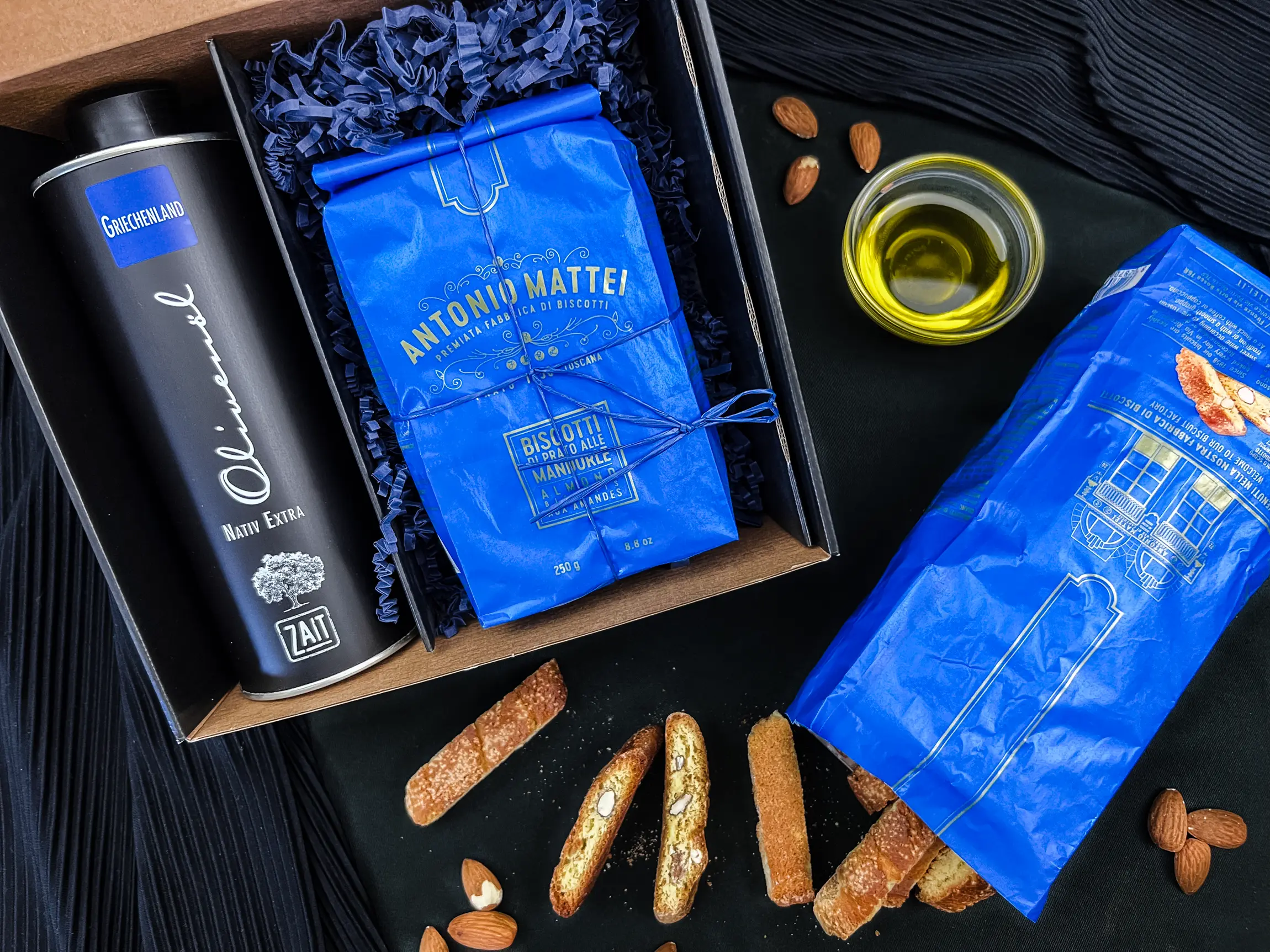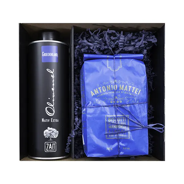 Ein mediterranes Duo für Genießer: Unser fruchtig-mildes Olivenöl von Kreta überzeugt mit dezenten Noten von grünen Früchten und einem sanften Abgang. Dazu die knusprigen Cantuccini La Mattonella, zart gebacken und mit feiner Mandelnote – perfekt zum Kaffee oder als süßer Abschluss eines mediterranen Menüs.