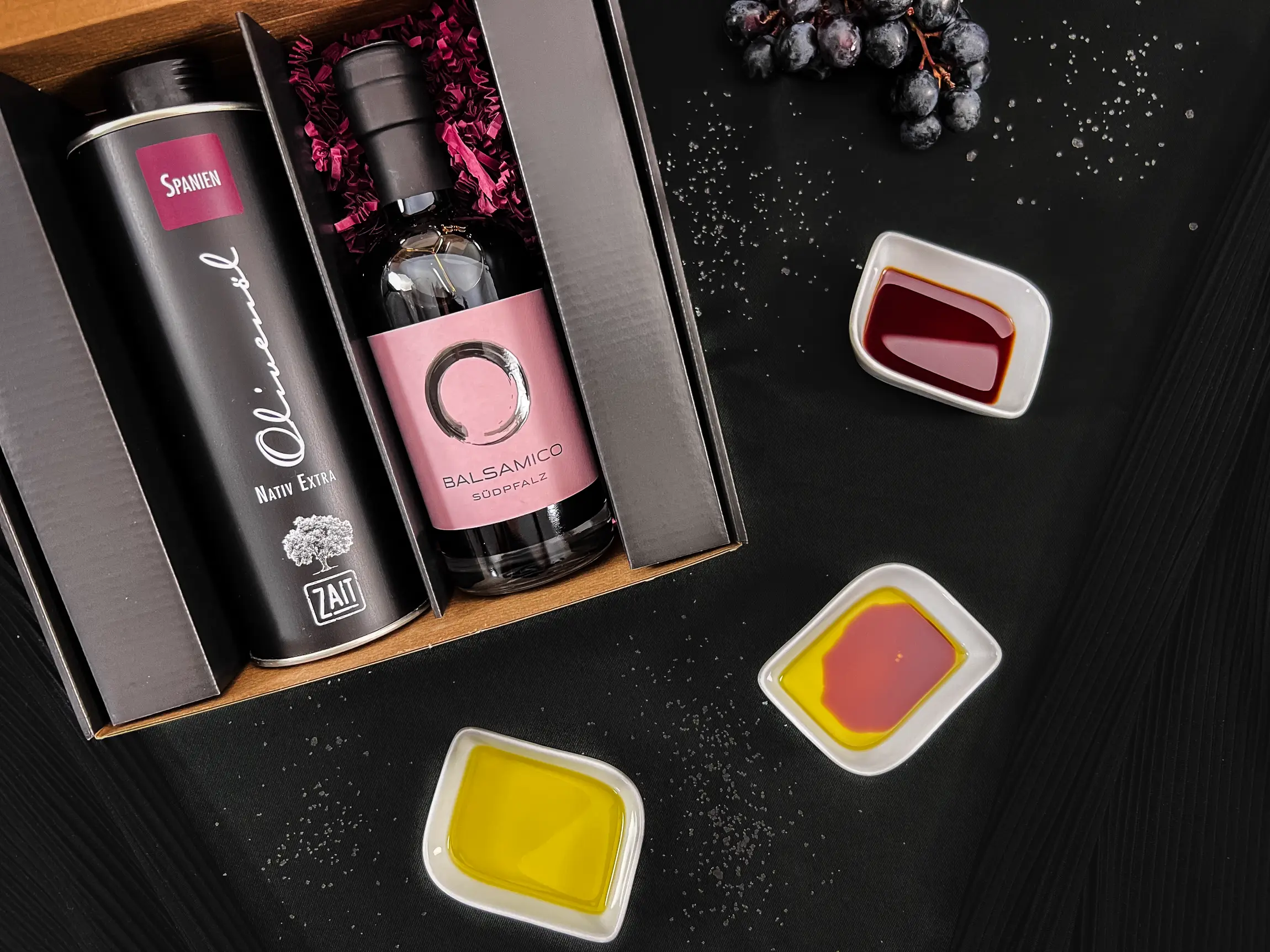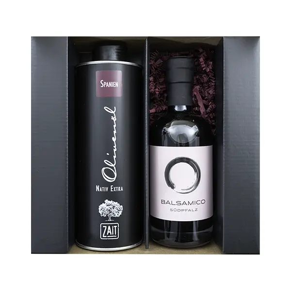 Der Balsamico aus der Südpfalz, nach italienischem Vorbild hergestellt, reift in Eichen- und Kastanienfässern. Er bietet eine perfekte Balance zwischen der Süße des eingekochten Traubenmosts und der feinen Säure des Weinessigs. Salate, Saucen und Marinaden erhalten durch ihn eine besondere Note. Dazu unser feines Olivenöl aus Katalonien – eine perfekte Harmonie.