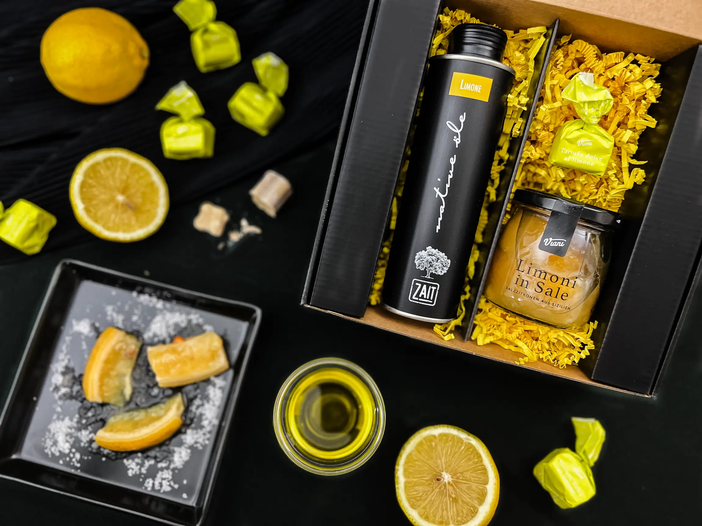 Ein feines Zitronen-Trio: Das naturbelassene Zitronenöl aus Oliven und frischen Zitronen verbindet fruchtiges Zitronenaroma mit der milden Note des Olivenöls – ohne künstliche Zusätze. Dazu die Salzzitronen von Sizilien, eingelegt mit Lorbeer, Nelken und Pfeffer, würzen Fisch, Geflügel, Salate oder leichte Pastagerichte mit intensivem Zitruskick. Abgerundet wird das Set durch den zart-cremigen Tartufo al Limone, ein feines Dessert-Highlight.