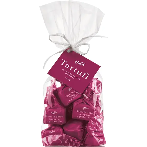 Feinste Trüffelpralinen aus weißer Schokolade, veredelt mit gehackten und gemahlenen Pistazienkernen. Die zarte Süße der Schokolade verbindet sich harmonisch mit dem nussigen Pistazienaroma und der fruchtigen Note getrockneter Himbeeren.